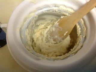 ヨーグルトとプリンの賞味期限延ばそうと、アイスクリーマーに混ぜ入れて、メープルシロップ入れてアイス作り