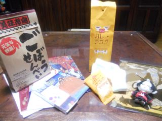O川夫人からはごぼうせんべいと美術館のお土産いろいろ、I村さんからはタオルハンカチとカレーラスク、Mリンさんからは鬼灯さんのクリアファイルとストラップを頂きました。