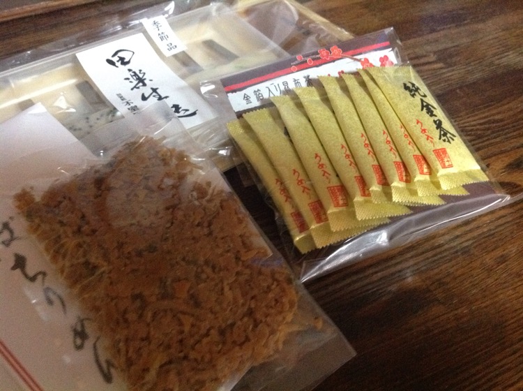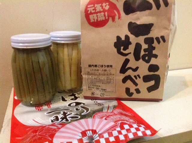O川夫人からゴボウせんべい、瓶詰め、きびだんご、海苔ふりかけ(きびだんごは冷蔵庫)