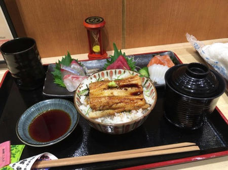お昼は芳野で穴子丼と刺身の限定ランチ。