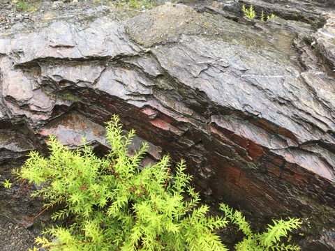 黒色片岩の鉄分が酸化して赤くなっています。