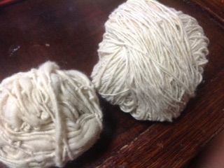左下が最初の布団綿で作った糸。