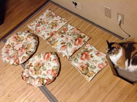 5月は古いカーテンで猫ベッドやら椅子の座布団やら、小さい手提げ、座椅子枕、ハンカチや風呂敷でお薬手帳なんかを大量生産しておりました。