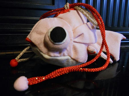 そんな今日の縮緬細工はまた出目金。色は桃色で可愛い色ですが、顔が変…。