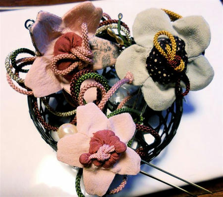 桜袋も梅袋も縮緬細工の定番ですが、袋の中に匂い玉をいれて、かんざしに仕上げてあります。