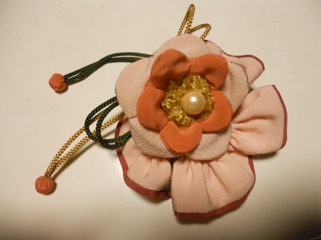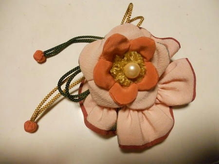 シュシュという洋物と梅袋という和物の合体なので、真ん中に大きいビーズ?をつかって、ちとチープな感じにしてみました。