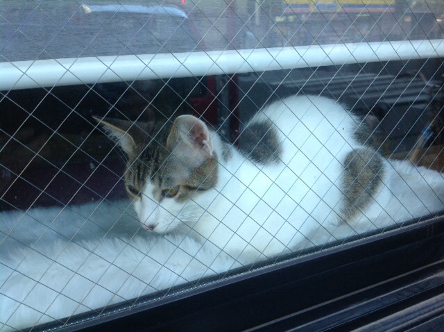 早稲田通りを歩いていたら、途中、窓に猫さんが。