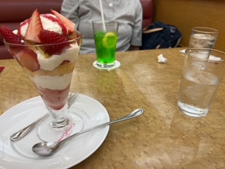 帰路はなんとなく近く感じつつ、田無の駅ビルでお茶しましょうと、大旦那はメロンソーダ。私は苺ケーキパフェ。
