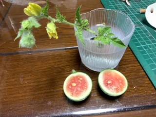 窓柵栽培西瓜が小さいながらも収穫出来たので、包丁を入れました。