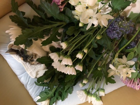 箱と花を用意して、みい様を納め、鰹節とドライフードを入れ、
