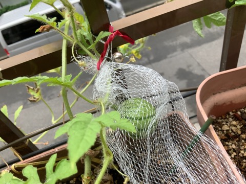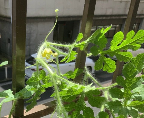 窓柵栽培で蒔いたスイカの種ですが、花も咲いて小さいスイカも実りました。