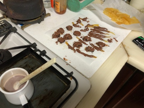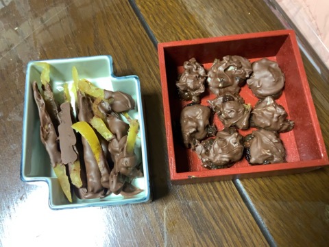 晩白柚を衝動買いして、皮が勿体無いので煮てチョコ付けました。