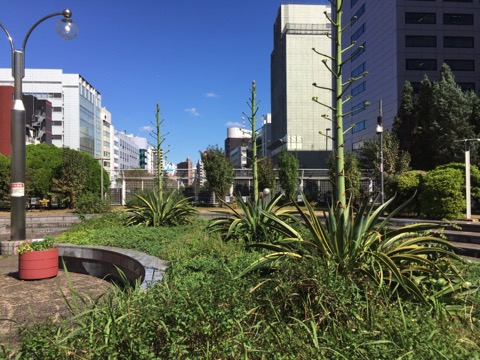 五十年に一度花を咲かせて枯れるという竜舌蘭の花が咲きそうというTwitter情報で、銀座築地川公園へ(まだ蕾でした)