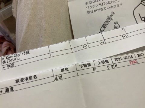 抗体検査の結果、コロナ19抗体は出来ていました。よかった。