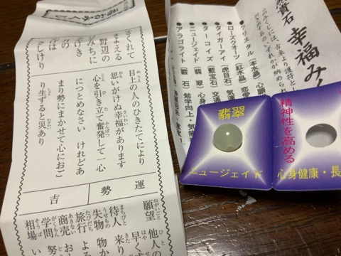 お不動様の御神籤は内容のいい吉で、天然石は翡翠。