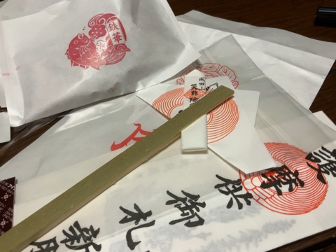 お不動様の護摩札と災難避けをいただき、お土産に鯛焼き。