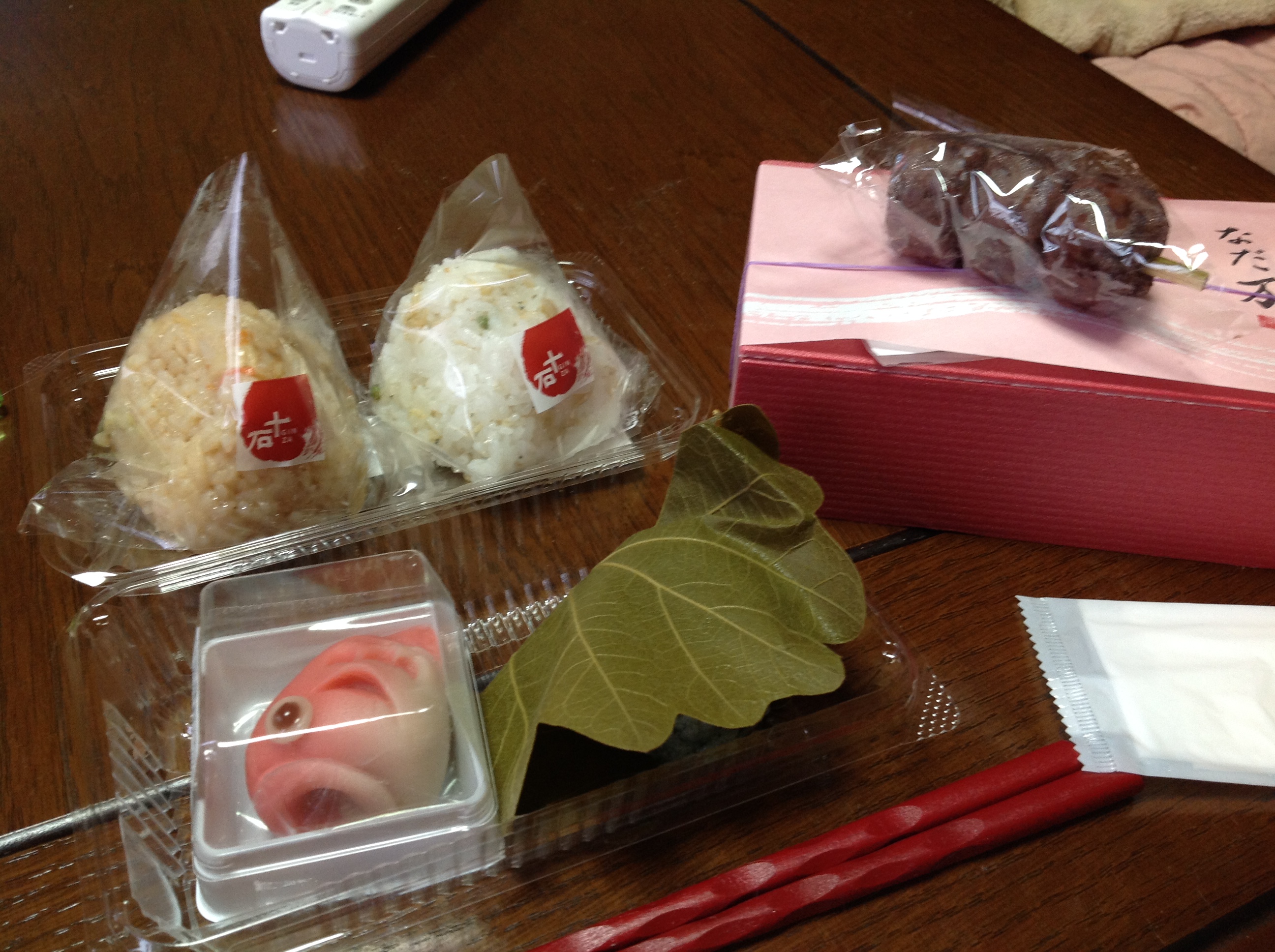 仏壇用におにぎり(私の朝ごはんでもある)と5月っぽいお供え物(明日と明後日のおやつでもある)私の今日の夕飯とおやつ買って帰宅。