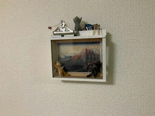 トイレに座っていると前の壁がつまらなくて、トイレに他人の絵を飾るのも悪いなと、ハンズで買ったミニチュアハウスを組み立て、設置してみました。