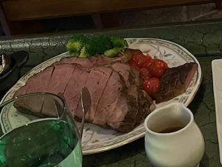 まずは桜入ウエルカムドリンク、可愛い前菜に、追加したドリンクの桜のソーダ、メインの恐ろしく分厚いローストビーフと付け合わせ。