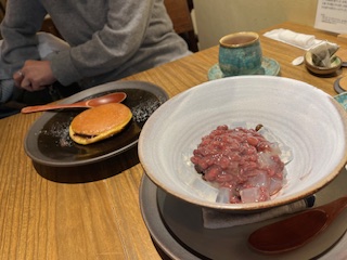 うさぎ屋カフェで私はみつ豆、師匠はどら焼きのバタ焼き。
